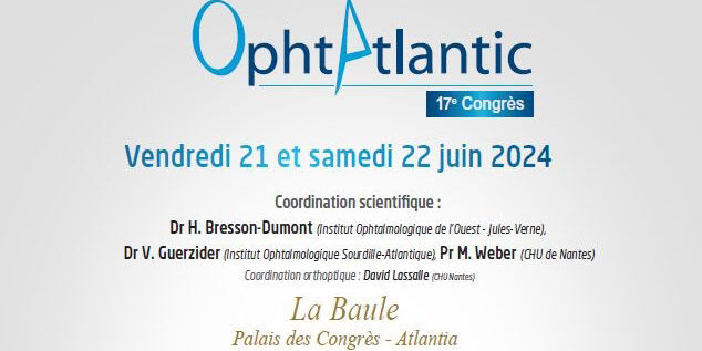 La 17ème Edition d’OphtAtlantic se déroulera du Vendredi 21 Juin 2024 au Samedi 22 Juin 2024 à la La Baule (Centre de Congrès Atlantia).